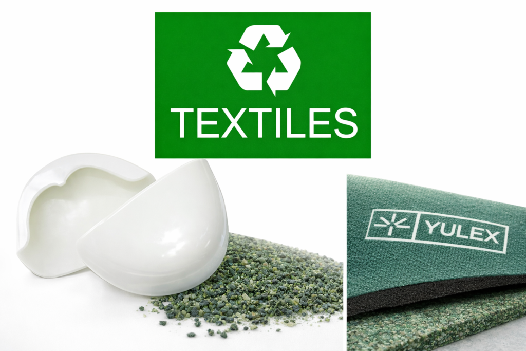 These materials may include recyclable textiles, recyclable nano protective toe caps, and YULEX® plant-based natural rubber materials used in selected footwear components